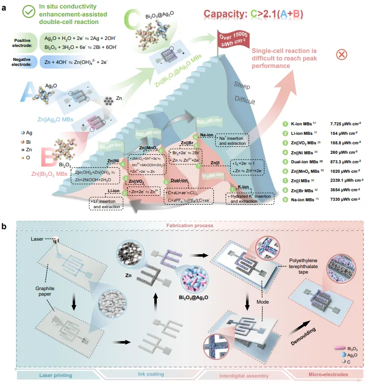 图1:原位电导率增强辅助双电池反应策略示意图及器件制备流程。(a)对比单电池反应难以达到峰值性能,本策略将Zn||Ag2O和Zn||Bi2O3两个微电池集成于单一器件,利用Ag2O还原生成的Ag原位增强Bi2O3电导率,实现总容量超过两单独电池之和的2.1倍,能量密度突破15000μWh cm-2;(b)激光直写石墨纸制备叉指微电极,经浆料涂覆、模板组装和脱模工艺构建Zn||Bi2O3@Ag2O微电池。