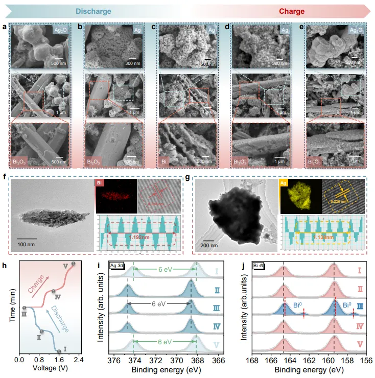 图4:反应机理的形貌与化学态演变表征。(a-e)放电过程中Ag2O纳米球先还原为粗糙Ag颗粒包裹Bi2O3微棒,随后Bi2O3微棒转变为空心Bi,充电过程可逆恢复;(f-g)TEM证实放电产物Bi和Ag的晶格结构;(h)充放电各阶段电压-时间曲线;(i-j)XPS追踪Ag3d和Bi4f峰位变化,证实Ag2O/Ag和Bi2O3/Bi的可逆转化。