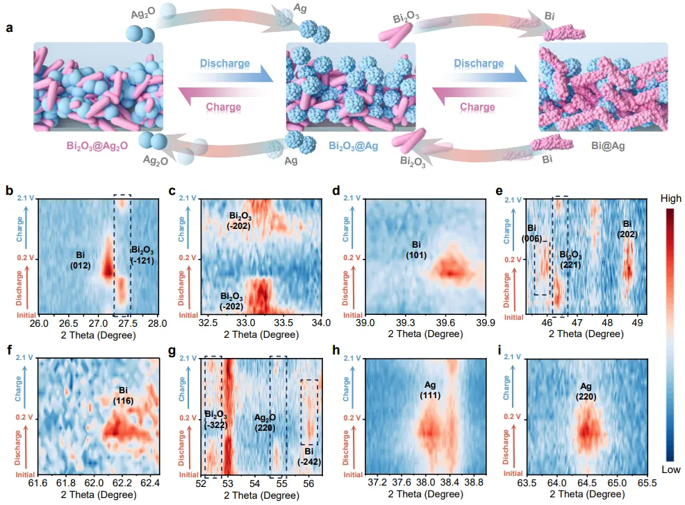 图5:原位XRD与反应机理示意图。(a)Bi2O3@Ag2O↔Bi2O3@Ag↔Bi@Ag的可逆结构转变示意图;(b-i)原位XRD热图显示放电时Bi2O3特征峰逐渐消失、Bi峰出现,Ag2O(220)峰减弱同时Ag(111)和(220)峰增强,充电过程完全可逆恢复。