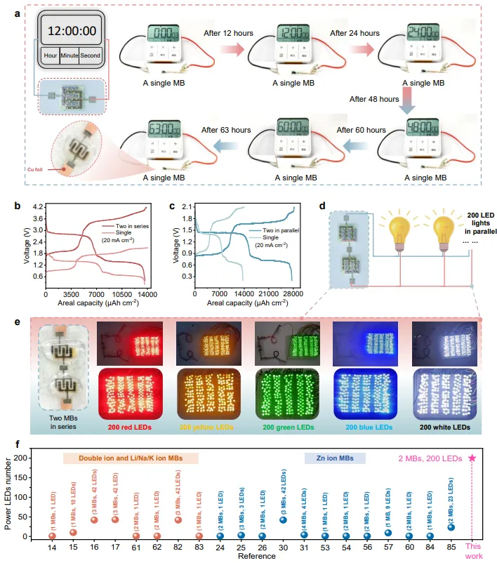 图6:微电池的实际应用演示。(a)单电池驱动计时器持续工作3780分钟(超2.5天);(b-c)两电池串联电压达~3V,并联容量翻倍;(d-f)两串联电池可驱动200个红/黄/绿/蓝/白LED,数量超越所有报道微电池系统;(g)柔性电池阵列弯曲状态下稳定供电。