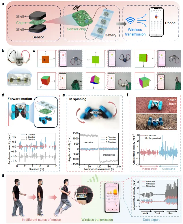 图7:无线智能传感器集成应用。(a)微电池-传感器-手机无线传输系统示意图;(b-c)传感器实时监测X/Y/Z三轴偏转状态并无线传输至手机;(d-f)集成于玩具车精准追踪加速度、角速度及不同地形运动状态;(g)佩戴于人体手臂实时监测行走、静止、跑步等运动状态。