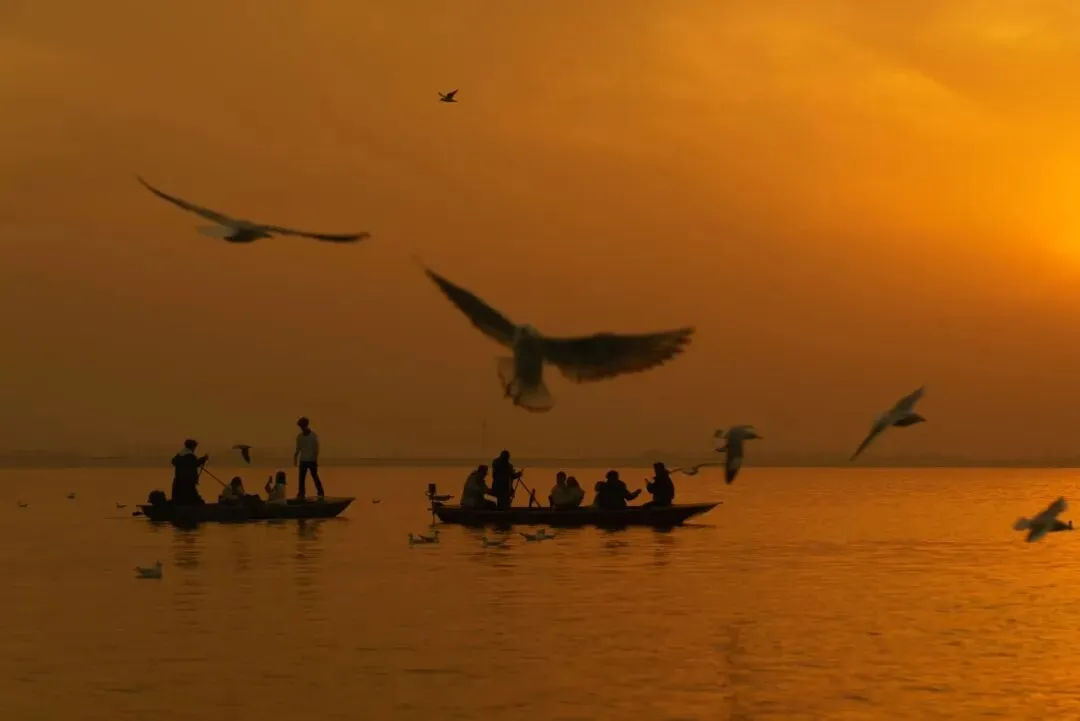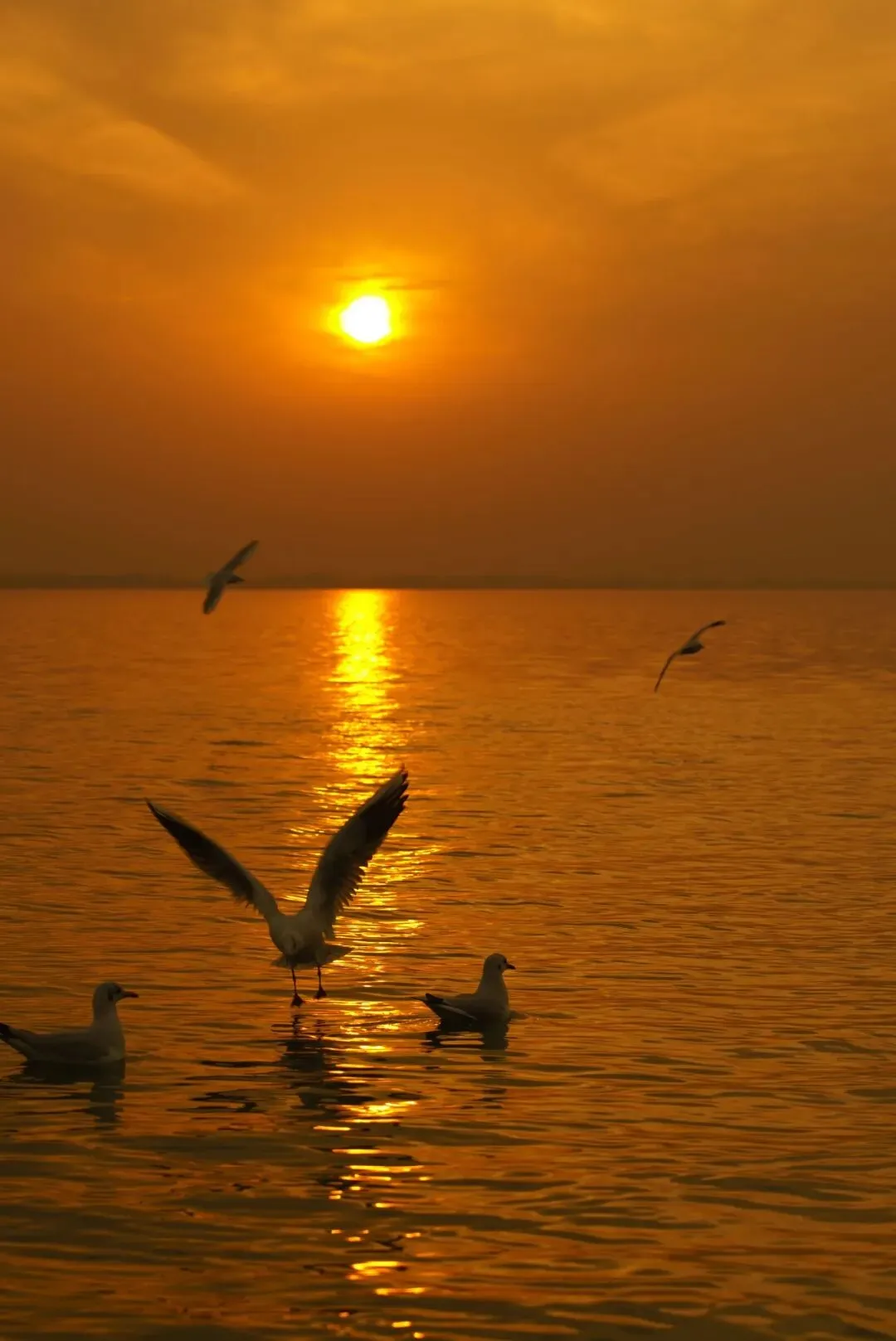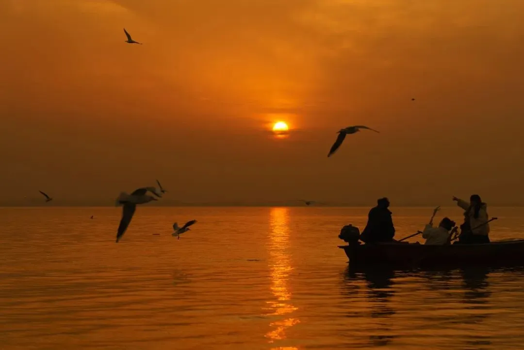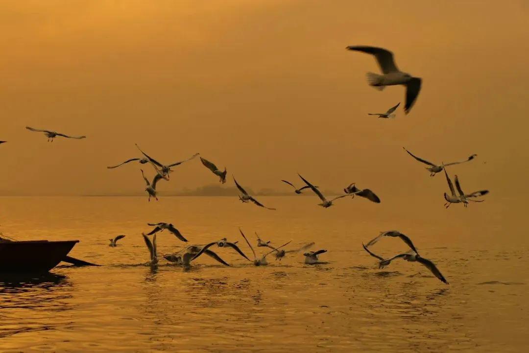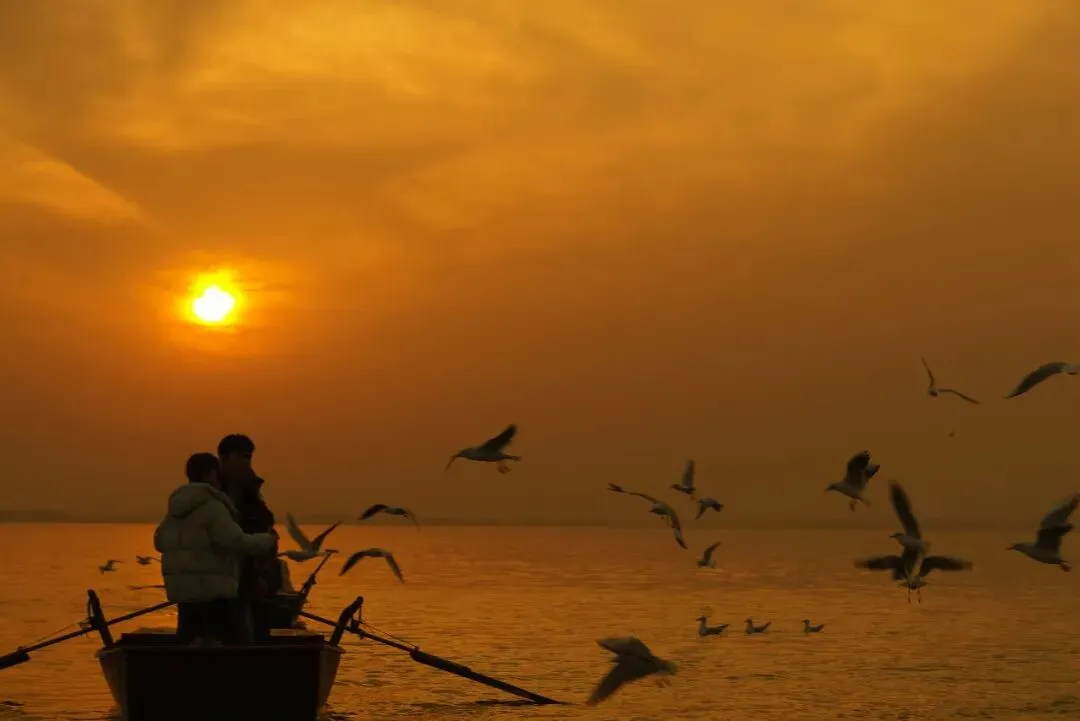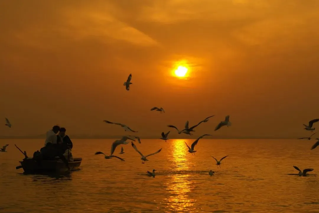 推荐:日落时分,暖橘色的夕阳洒在湖面,小船被海鸥环绕包围,氛围感直接拉满。