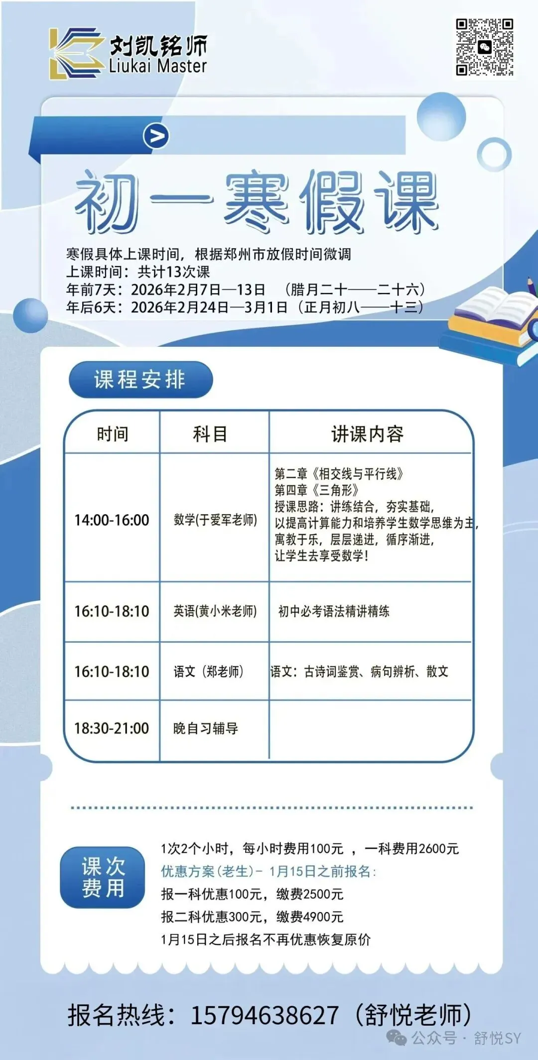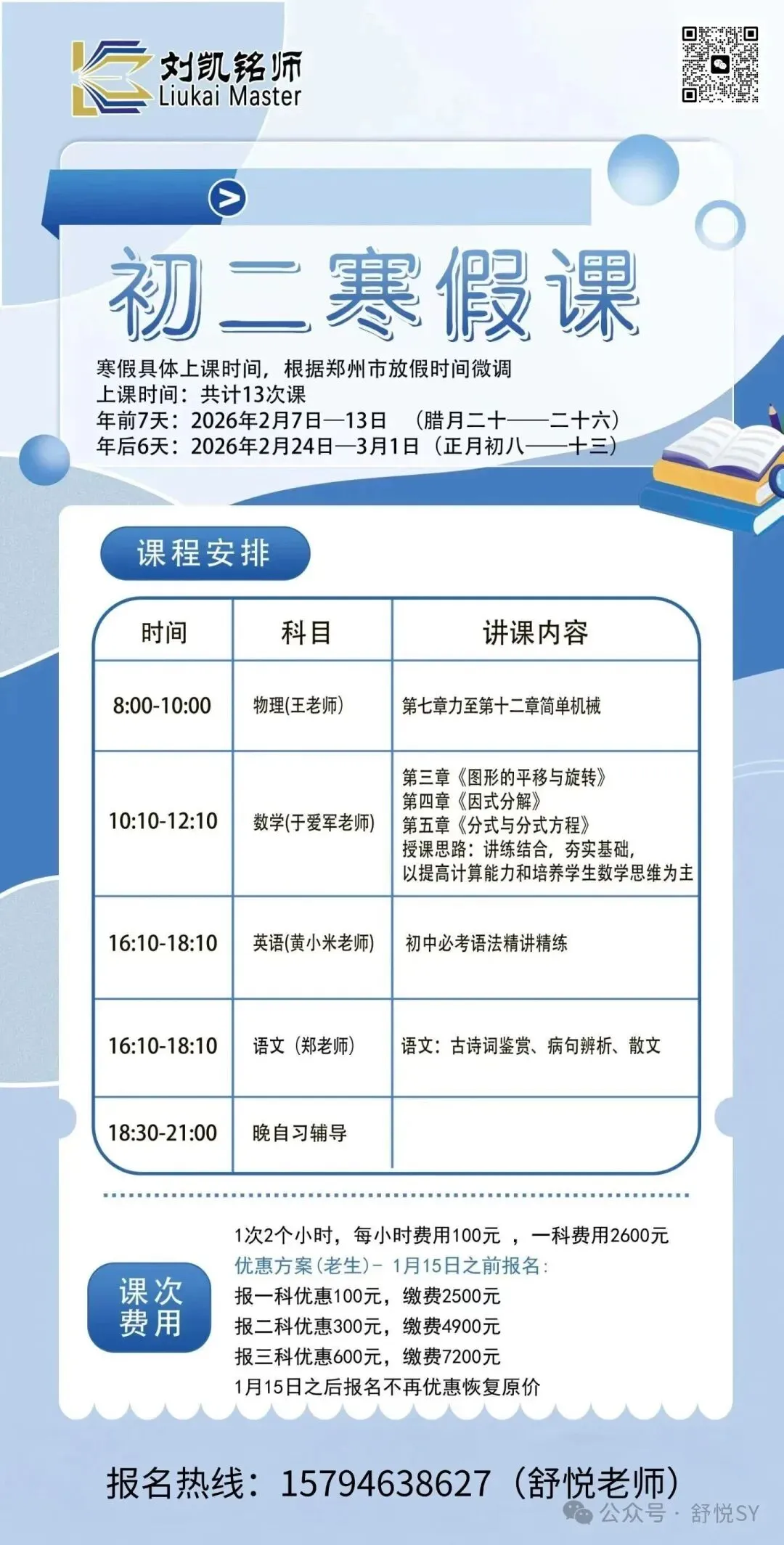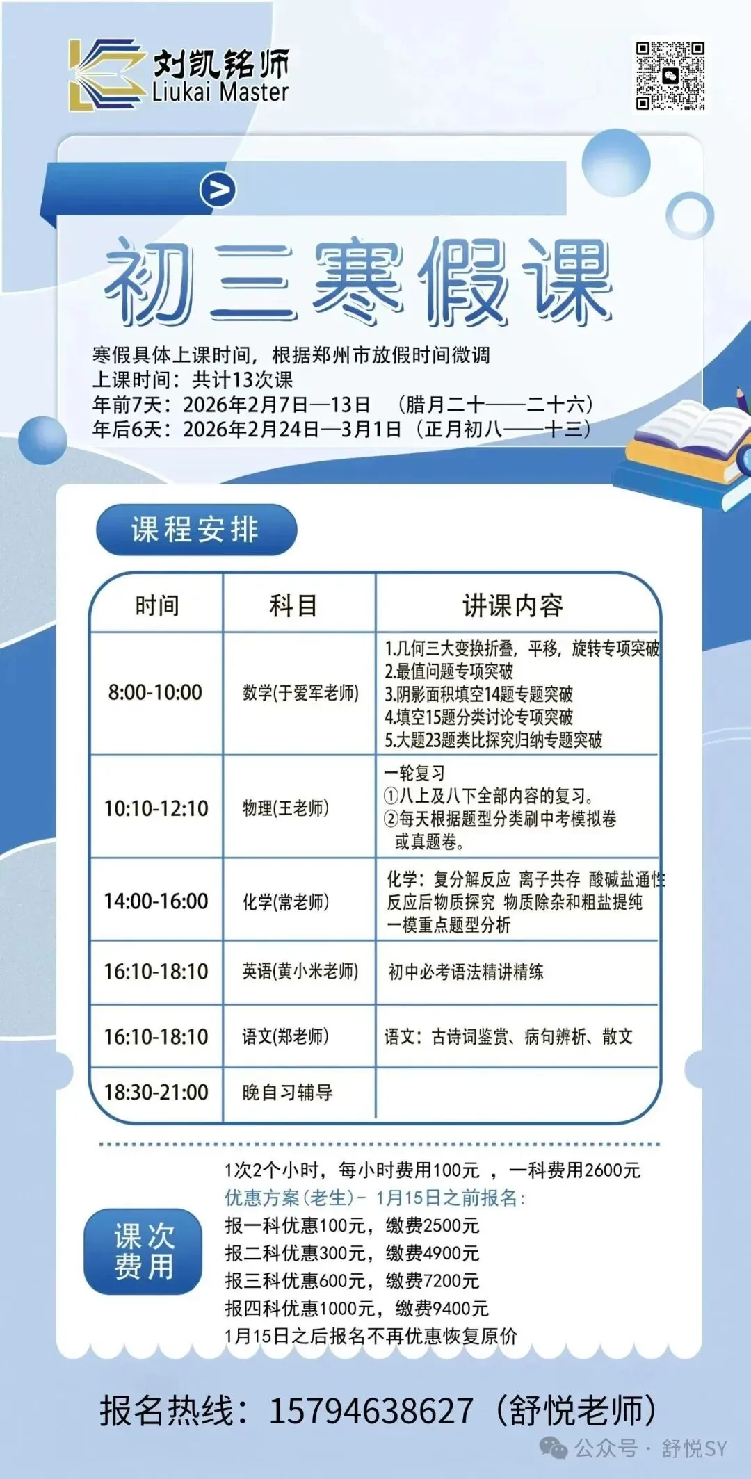 刘凯铭师寒假中高考提分营现已开启招生,具体详情如下: