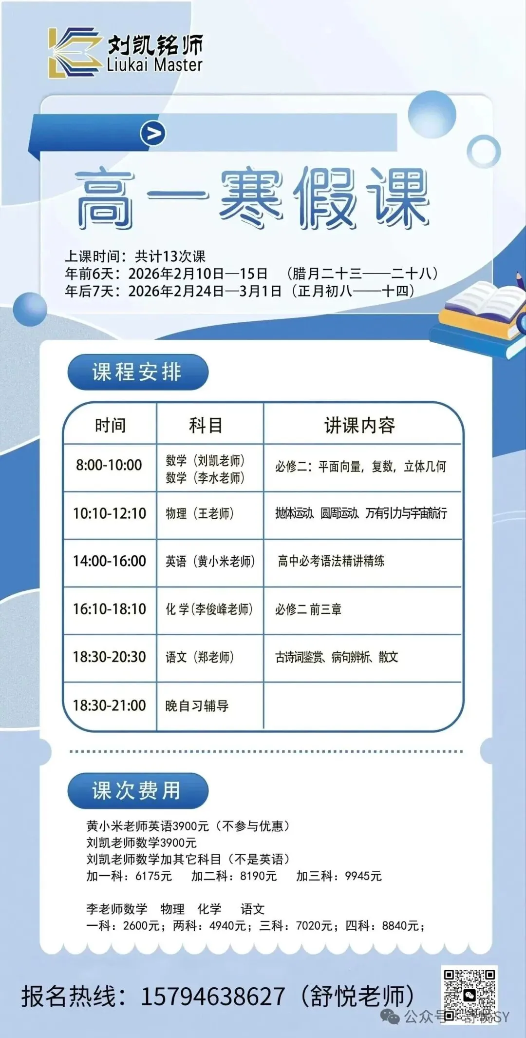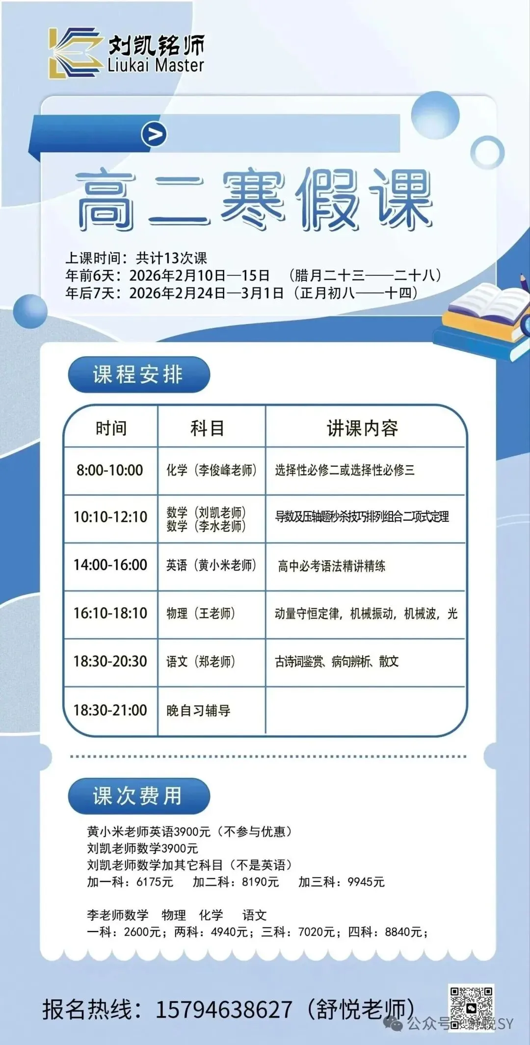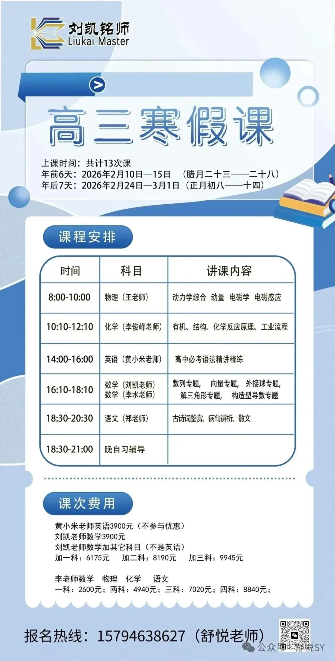刘凯铭师寒假中高考提分营现已开启招生,具体详情如下: