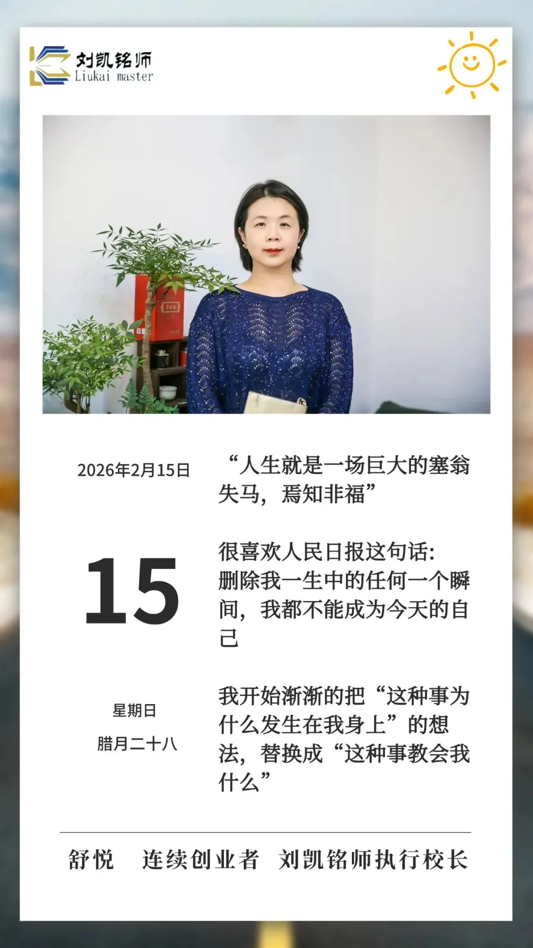连续创业者,跨界考取「家庭教育指导师」和「心理咨询师」,原石油公司老板,原工程公司老板,自律达人,连续十几年早起并写日记,现为刘凯铭师教育机构执行校长,非常喜欢学习,累计学费300余万,擅长销售,喜欢和人打交道,二孩宝妈,「中高考全科提分」在招生中,有意者私 sy972413。