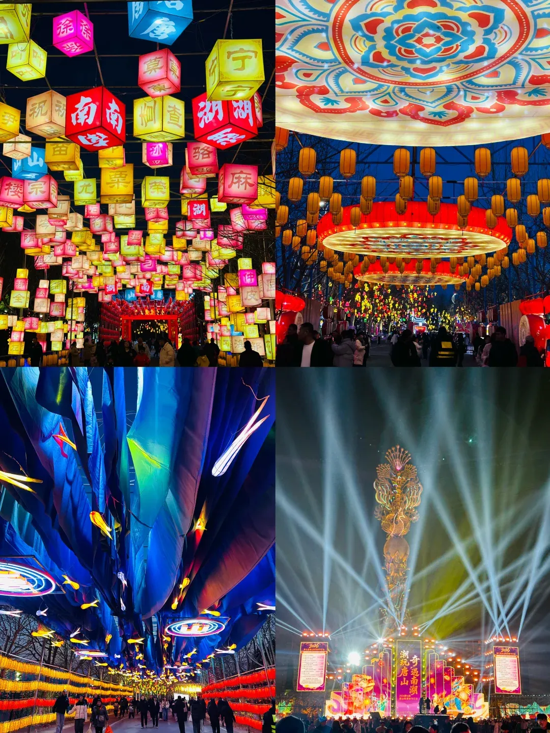 如果说白天的矿井是黑色的深沉,晚上的南湖就是彩色的喧嚣。这里的灯会规模巨大,数百组巨型彩灯倒映在湖水中,配合无人机表演和打铁花,视觉冲击力极强。走在冷风中,看着满眼璀璨,手里捧着一杯热梨汤,那种「盛世」的虚幻感很迷人。