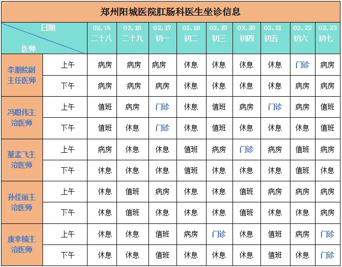 为方便您合理安排就诊时间,郑州阳城医院肛肠科现将春节假期医生排班公布如下。您可根据排班表,选择适合的医生进行咨询与诊疗。