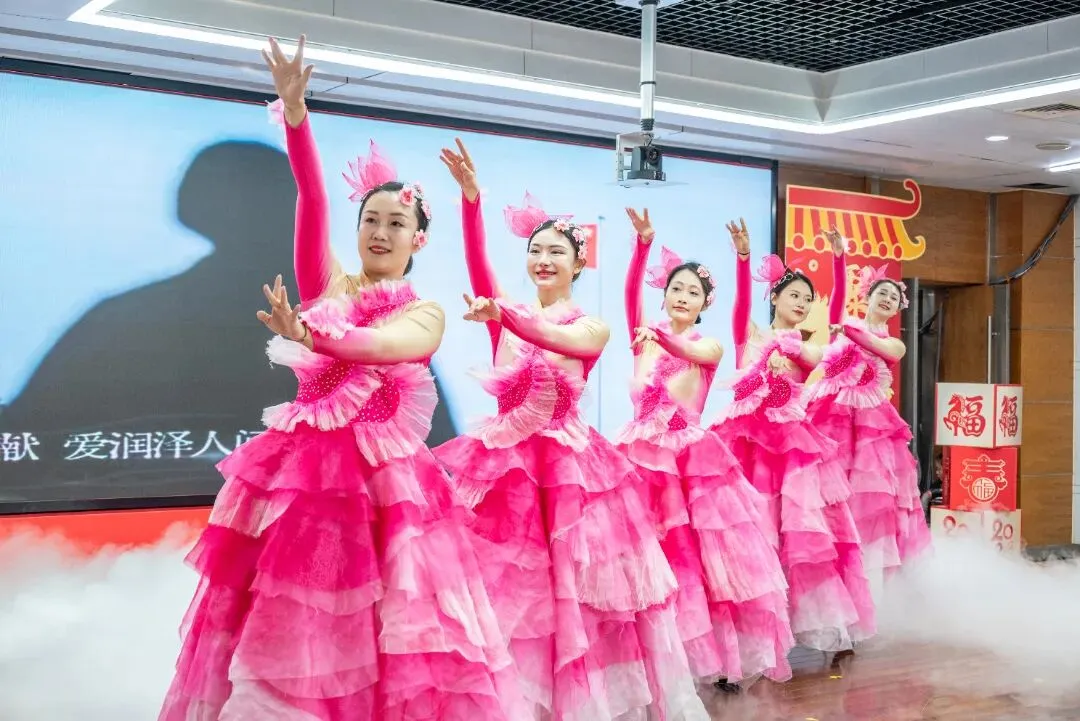 舞者们手持花扇,翩翩起舞