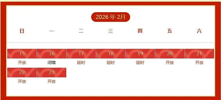 2月15日—2月19日(腊月二十八至正月初三)、2月28日—3月3日(正月十二至十五)闭馆维护。