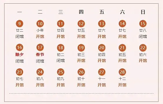 2月14日(腊月二十七)、2月20日—2月27日(正月初四至十一)正常开馆。