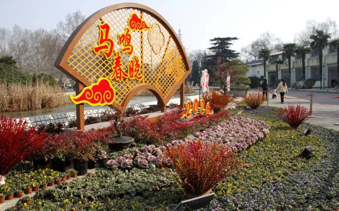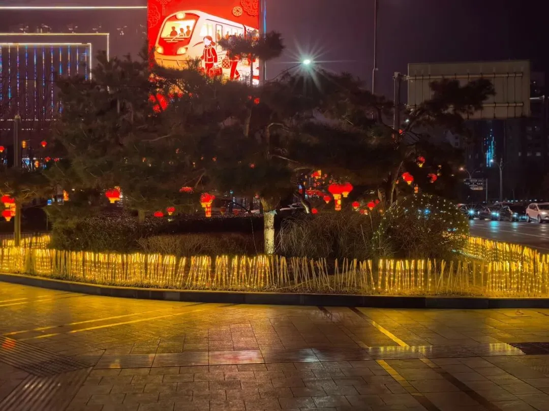 农业南路上,路口一角的绿化景观被各式彩灯装扮一新。