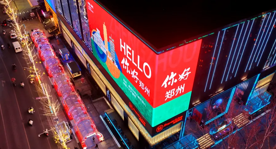 花园路与农科路口,户外大屏、楼体灯光与地面装饰灯交相辉映。
