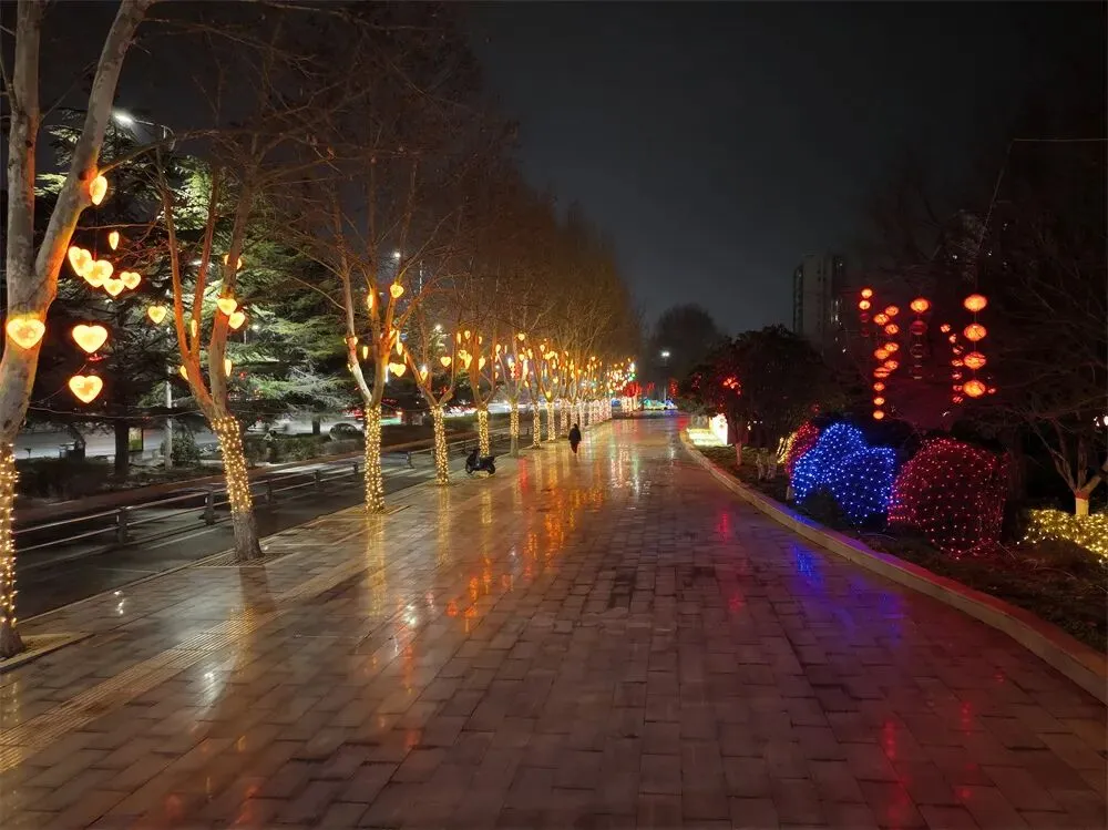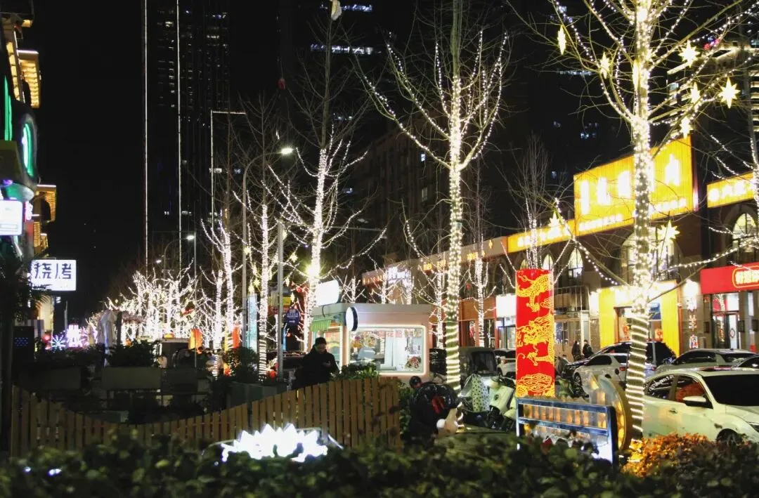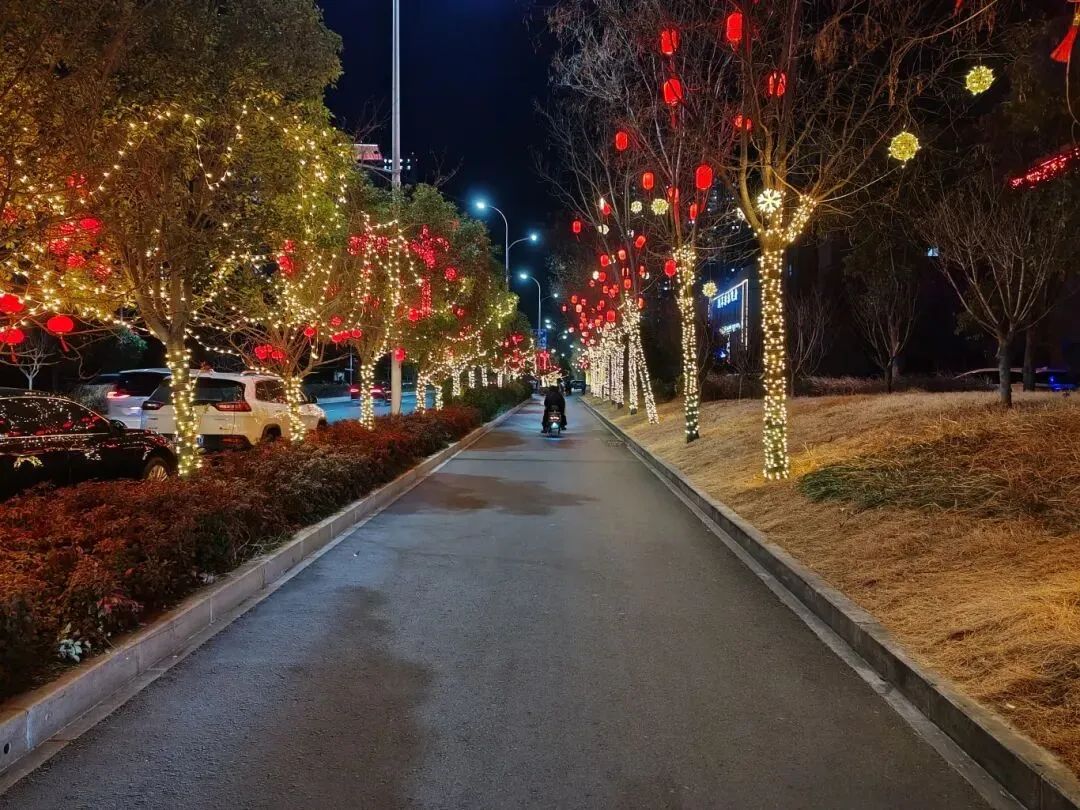 LED灯带和八角星装饰灯把农科路行道树包裹起来,打造出火树银花的梦幻感。