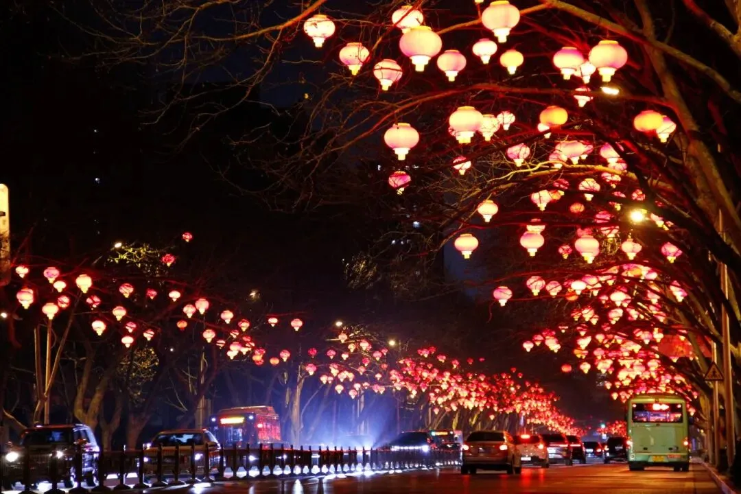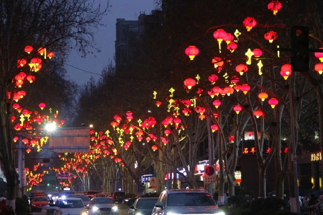 建设西路、华山路上,高大的法桐枝条上挂满了红灯笼。
