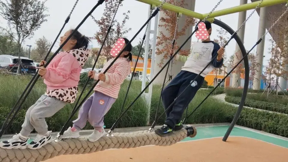 这个滑索设置在公园儿童区的核心位置,轨道大概有二三十米长,两端微微抬起,中间自然下垂。孩子双手抓住把手,双脚离地,“嗖”地一下从这头滑向那头——风在耳边吹,身体在飞翔,脸上全是抑制不住的笑。