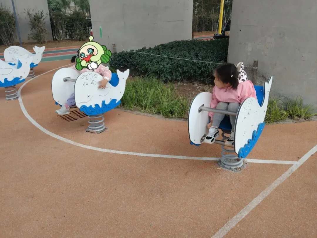 几个彩色的小转椅,轻轻一推就能转起来;还有造型可爱的摇摇马,适合低龄宝宝。因为是新公园,这些设施颜色鲜亮,拍照特别出片。