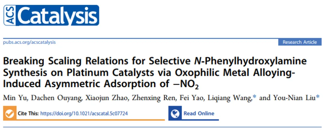 Yu M; Ouyang, D; Zhao X; Ren Z; Yao F; Wang L; Liu Y-N. Breaking Scaling Relations for Selective N‑Phenylhydroxylamine Synthesis on Platinum Catalysts via Oxophilic Metal Alloying‑Induced Asymmetric Adsorption of –NO2. ACS Catal. DOI: 10.1021/acscatal.5c07724