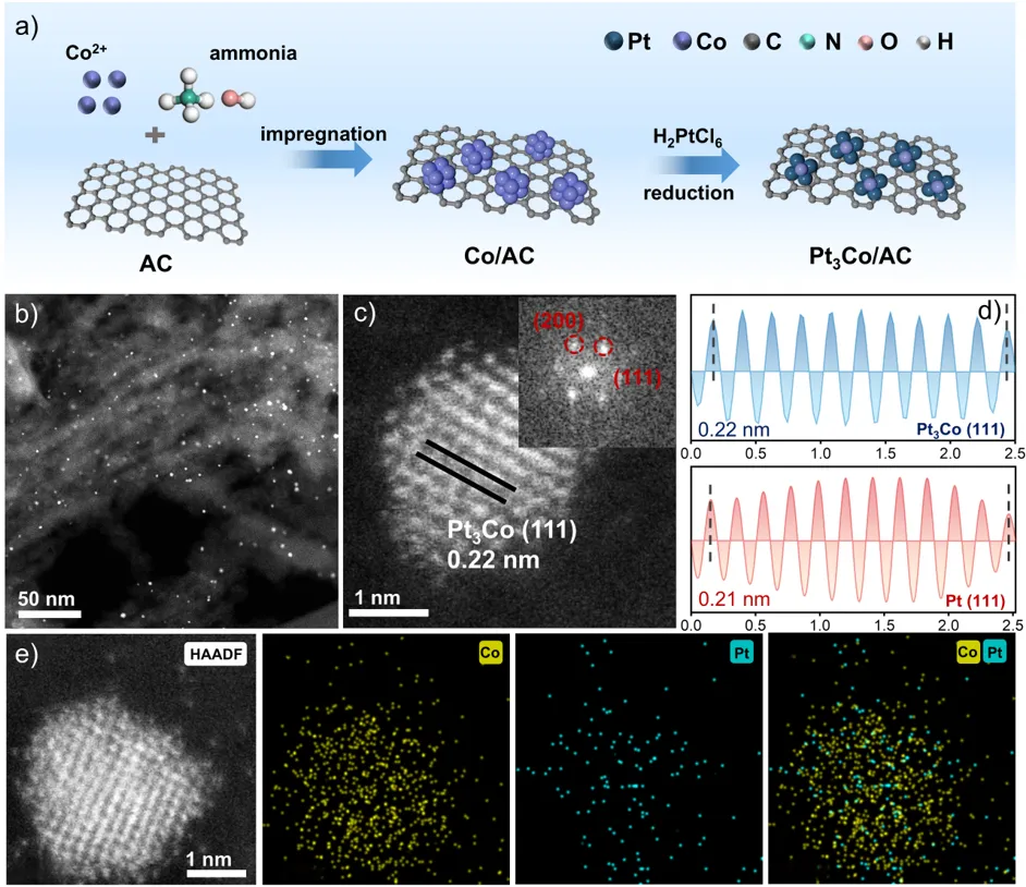 如图所示,采用顺序沉积-沉淀法,经过煅烧和还原合成了活性炭(AC)负载的Pt3Co合金纳米催化剂。高分辨透射电镜(HRTEM)和球差校正HAADF-STEM成像显示,纳米颗粒均匀分散在碳载体上,其平均尺寸为2.7 nm,且Pt和Co元素在纳米颗粒内均匀分布,验证了Pt–Co合金结构的形成。