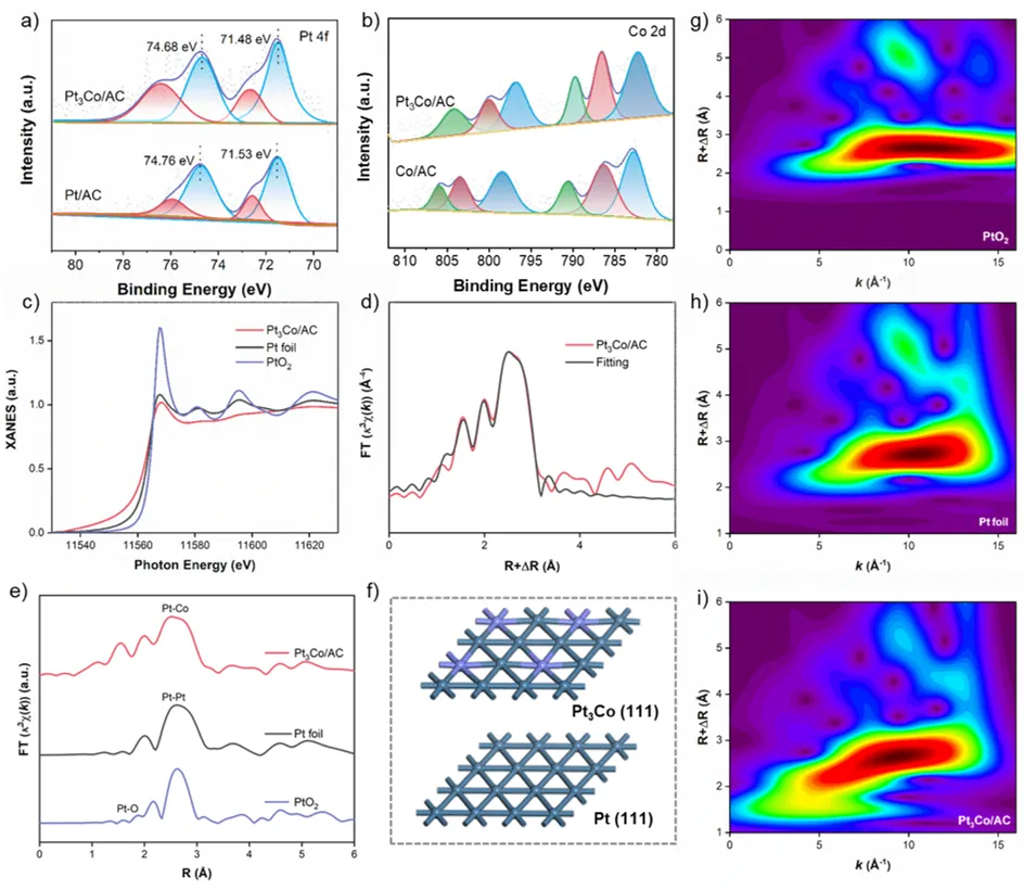 通过XPS和EXAFS表征,进一步明晰催化剂的配位环境和电子结构。XPS分析表明电子从Co向Pt转移,改变了Pt的电子结构,削弱了其d轨道与苯环π电子的耦合能力。EXAFS进一步证实了Pt–Co配位键的形成,并揭示Pt与Co配位形成Pt3Co结构。