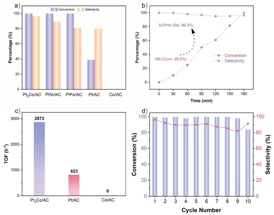 以硝基苯加氢为模型反应,Pt3Co/AC表现出较好的催化性能。在25°C、2 bar H2的温和条件下,3 h内实现了99.9%的硝基苯转化率和96.3%的N-PHA选择性,显著优于Pt/AC、商业Pt/C等催化剂。此外,测试了不同催化剂的本征活性,Pt3Co/AC催化剂的TOF值高达4201.5 h-1,比Pt/AC(3372.8 h-1)提升了25%,表明Co的引入显著提高了选择性和本征活性。同时,催化剂展现出优异的底物普适性,并在重复使用10次后,活性和选择性均未发生明显衰减,结构稳定性良好。