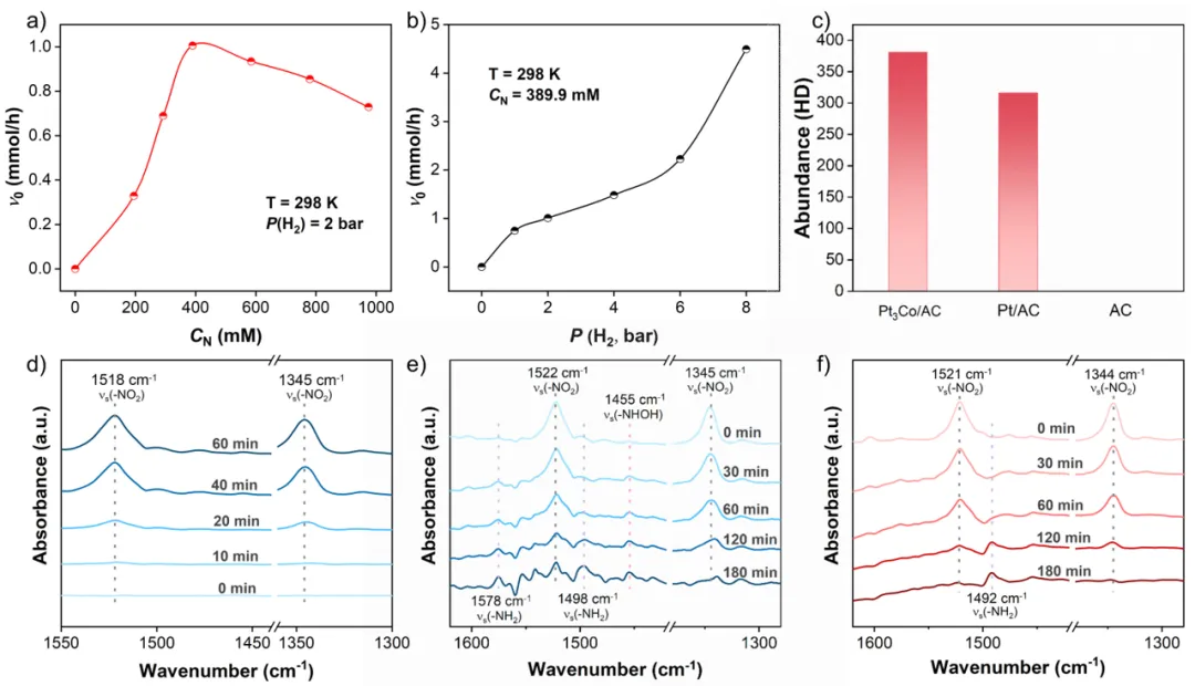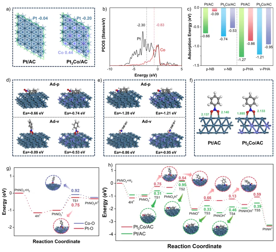 2. 揭示“不对称吸附”新机制:实验与理论计算结合,阐明Pt–Co双位点诱导硝基不对称吸附的机理,并实现反应物活化与产物脱附的功能分区。