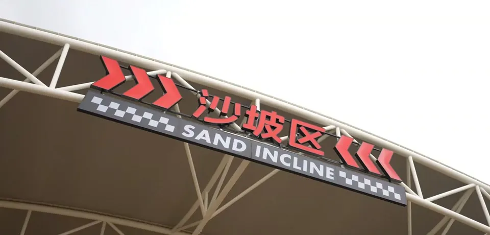 沙坡高29.6米,坡度28度,沙子一米厚,展示车辆的冲沙性能