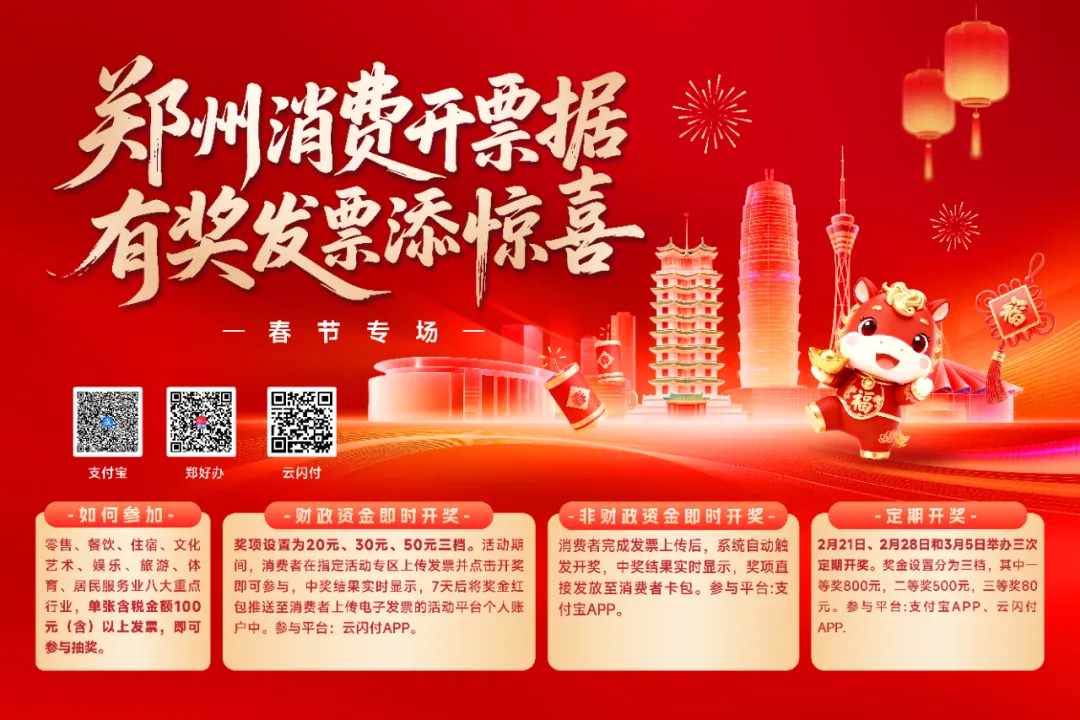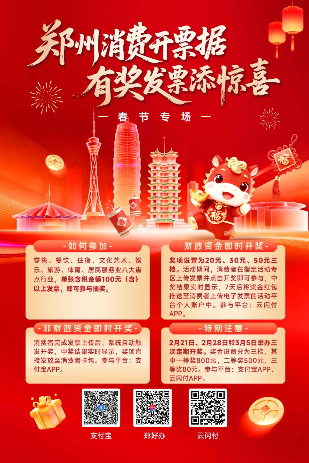 本次活动由市商务局、市财政局、市税务局、航空港实验区税务局等多部门联合承办,旨在通过发票抽奖形式鼓励消费者索取发票,规范市场秩序,促进消费增长。活动总奖金规模达2.6亿元,单张合规发票最高有机会获800元奖金。具体活动情况如下: