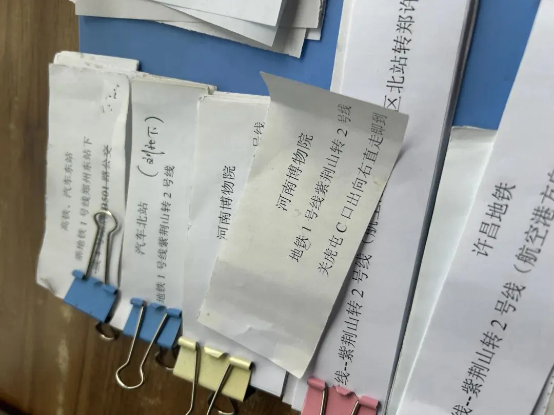 除了手绘线路图,对于常见的医院、学校、公交站、地铁站、公园、博物馆等地方,志愿者们还打印了小纸条,详细写明乘车线路和换乘情况。