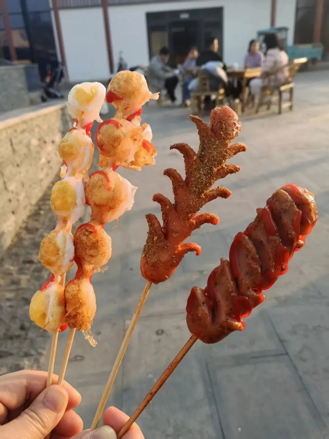 现在是赏梅花的好时节,走累了,路边有茶馆,还有很多小吃摊。