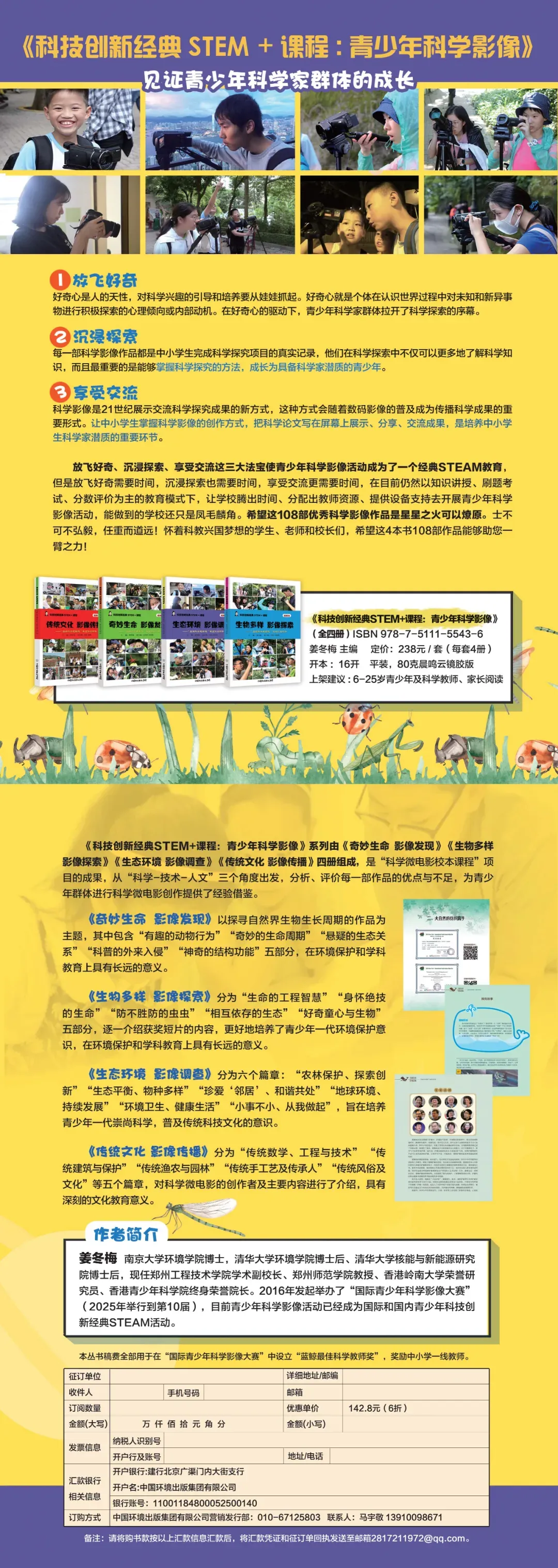 历届国际大赛获奖作品赏析已经由大赛组委会编辑成册,由人民出版社、中国环境出版集团出版,分别是《透过镜头 放飞好奇》《科学影像 点燃梦想》《传统文化 影像传播》《奇妙生命 影像发现》《生态环境 影像调查》《生物多样 影像探索》,书籍链接可扫二维码。