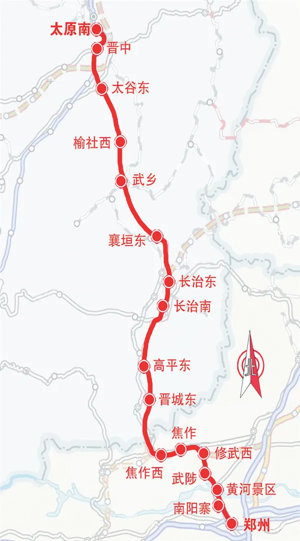 郑太高铁全长432公里,分两段建成:郑州至焦作段2015年通车,焦作至太原段 372公里于2020年底通车。它是国家 “八纵八横” 高铁网中呼南通道的核心组成部分,向北衔接张太高铁,向南联通焦洛平高铁,也是郑州 “米” 字形高铁网的西北向一捺。