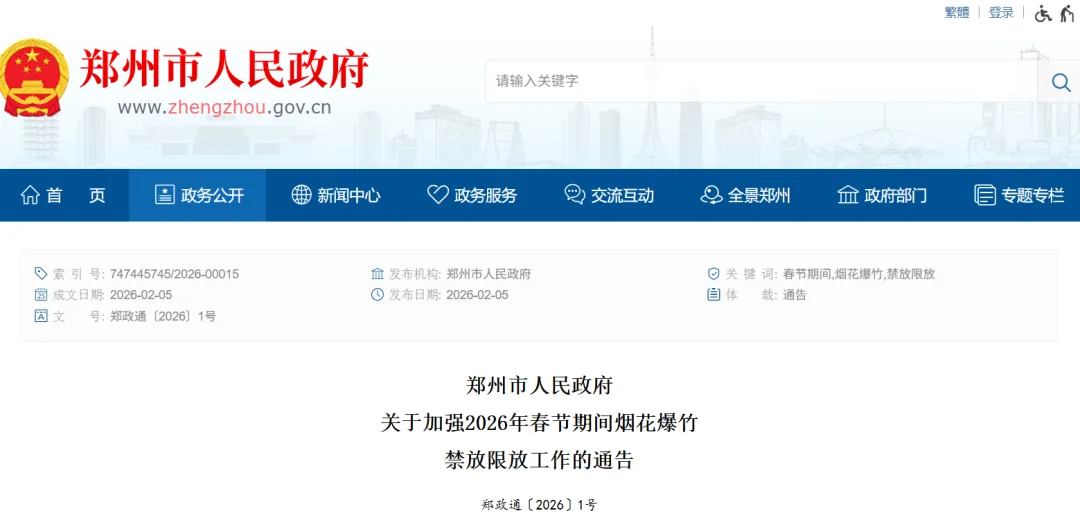 为加强2026年春节期间烟花爆竹管理工作,回应社会关切,减少大气环境污染,保障公共安全和群众人身、财产安全,确保春节期间烟花爆竹安全形势稳定,根据《烟花爆竹安全管理条例》(2016修订)和《河南省大气污染防治条例》等规定,结合我市实际,现就进一步做好我市2026年春节期间烟花爆竹禁放限放有关工作通告如下: