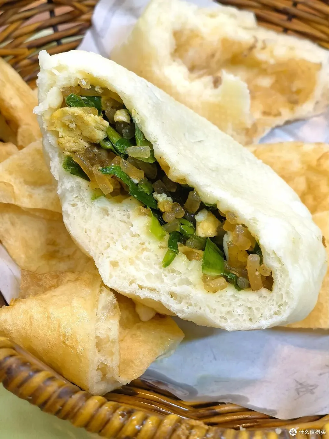 粉条韭菜鸡蛋炒馅儿的,皮比肉包薄很多,看着馅料也爽利不少,鸡蛋也有给,但在郑州早餐店里,仍然只是路人级别的水平。