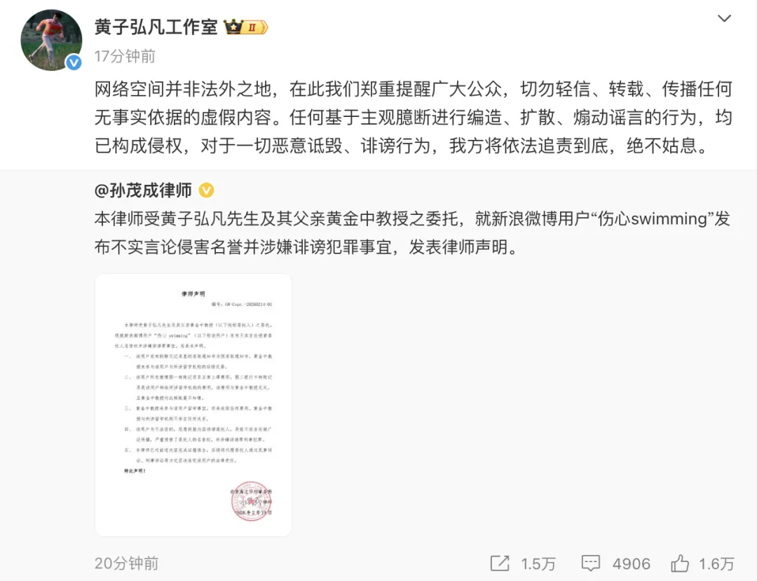 2月14日,歌手黄子弘凡父亲被曝诈骗学生,工作室发文回应:黄金中教授未参与该用户留学事宜,亦未收取任何费用,将依法追责。