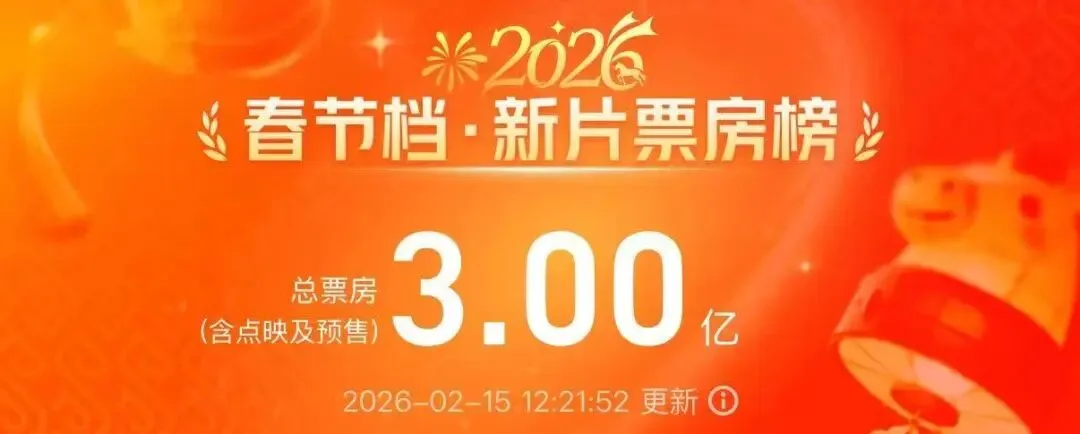 据网络平台数据,截至2月15日12时21分,2026春节档新片预售总票房突破3亿元。