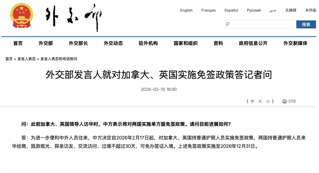 中方决定自2026年2月17日起,对加拿大、英国持普通护照人员实施免签政策。