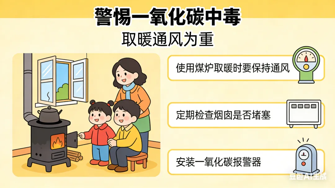 ①燃煤燃气设备确保通风,烟道定期检查,建议安装报警器。