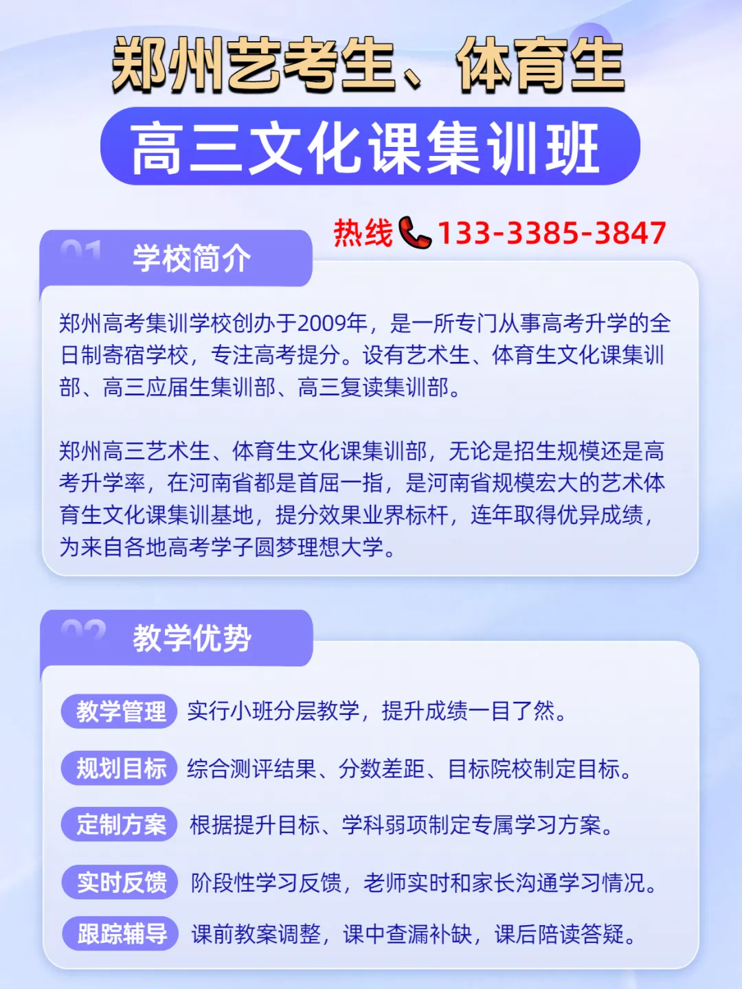 郑州优状元高考集训学校体高三艺术体育生文化课集训班,针对艺术体育生特点,精心打磨课程内容,基础知识讲解由浅至深、化繁为简。从“例题讲解、变式训练、测试、监督、反馈”,高效实行小班分层教学法。深入研究历年真题,反复审查,集团队之力量,匠心打造,让学习内容更权威。汇总经典易错题型,直击命题逻辑,巧避题目陷阱。教师悉心整理,为体育高考生冲刺集训量身定制课程内容和辅导服务,划分学科知识模块,让学习效率更高效,让提分更轻松!