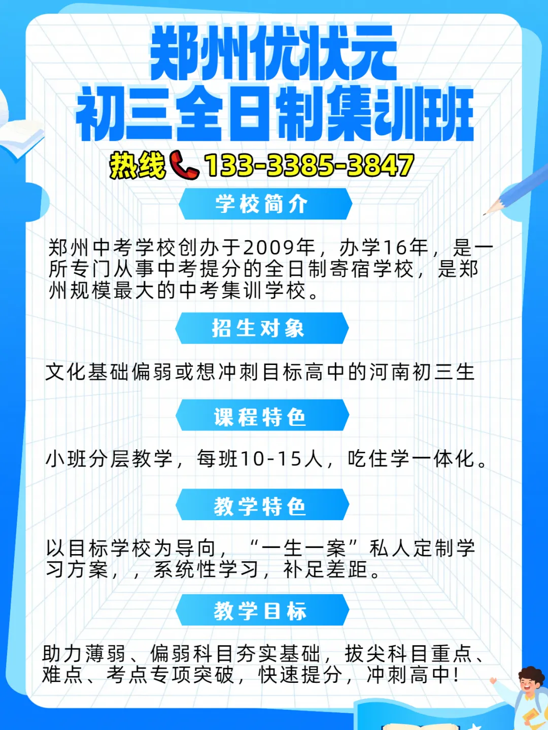 郑州优状元初三全日制封闭集训班【热线📞133-3385-3847】,作为一所专注于初三集训、中考冲刺的文化课培训学校。凭借优越的地理位置,营造了浓郁的学术氛围。该校成立于2009年,历经十六年稳健发展,致力于为广大学子提供全方位、高品质的中考备考支持。 依托雄厚的师资队伍、专业化的服务管理团队及舒适的学居环境,打造高效且富有活力的课堂生态,构建起比拼学业、磨砺意志的学习氛围,建立和谐融洽的师生互动关系,助力学生高效大幅提分,顺利升入理想高中。