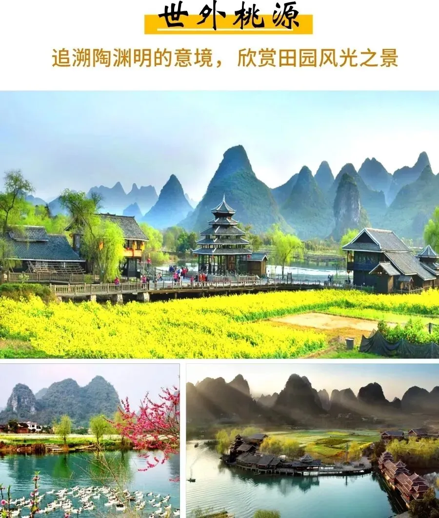 ●早餐后前往遗落在人间的仙境——【世外桃源】(AAAA级景区,游览时间约60分钟)亲身体验《桃花源记》中“小桥、流水、人家”的纯自然意境,绿树成林,莺歌燕舞,美不胜收。宛若陶渊明笔下“芳草鲜美,落英缤纷”,“有良田美池桑竹之属”的桃源画境,只要坐在这里,世上的一万年与我们又有什么关系呢。中餐,享用农家乐,品尝真正的桂林味道!