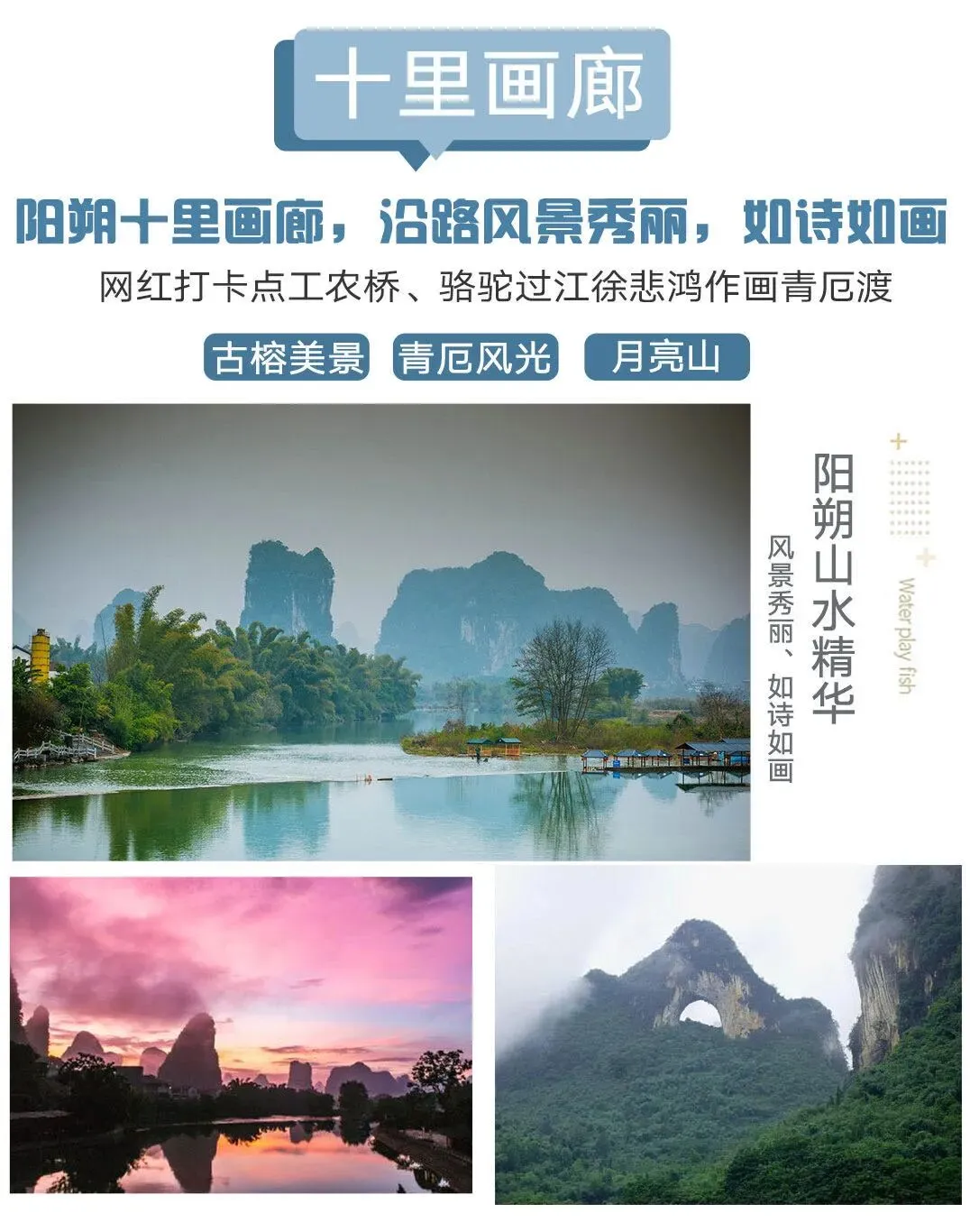●车观阳朔风景如画的线路【十里画廊】,也是阳朔最有颜值的一条道路。沿路风景秀丽,如诗如画,沿途,我们还会欣赏到著名阳朔美景【骆驼过江】,还可以欣赏到“人有悲欢离合,月有阴晴圆缺”的【月亮山赏月道】