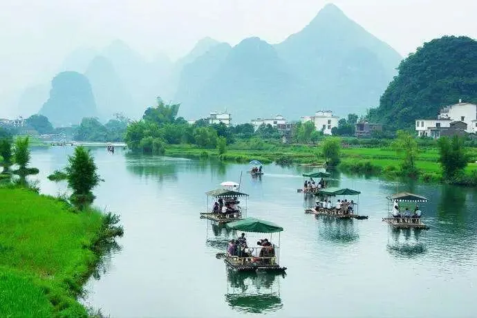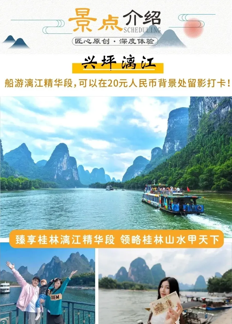 ●游览【山水画廊--竹筏漂游】(游览时间约40分钟)(由于水上项目,水流速度不定,因此具体游览时间以景区实际情况为准)筏行江中,宛如迎面打开一幅幅奇妙山水画卷,可观奇峰倒影、碧水青山,真正体会到“人在画中游”的绝美漓江仙境。(温馨提示:1.孕妇、残疾人、70岁含以上老年人/1.0米以下严禁乘坐竹筏。具体以景区当时标注为准。2.【竹筏漂流】为赠送项目,如因不可抗拒因素或个人原因未游览费用不退!)