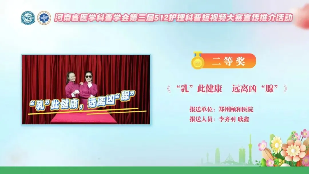 在河南省卫生健康委宣传处指导、河南省医学科普学会主办的“第三届5.12护理科普短视频大赛”上,我院放疗科护理人员李齐羽、耿鑫的参赛作品斩获“二等奖”。