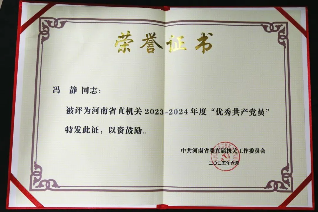 七一前夕,中共河南省委直属机关工委下发文件,授予我院内科党总支书记、呼吸内科一病区主任冯静为“河南省直机关优秀共产党员”。