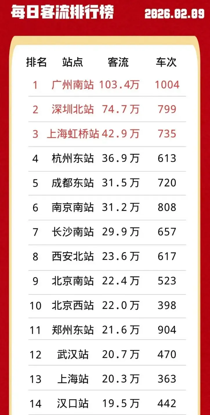 2月9日,广州南站停靠车次1004趟,客流量达到103.4万,在全国遥遥领先。