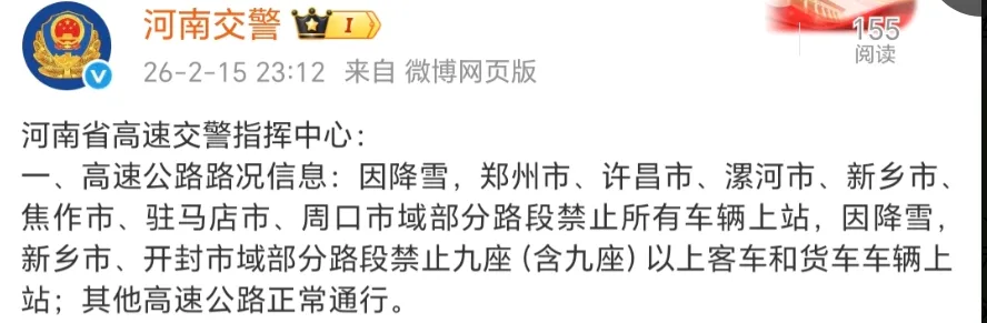 因降雪!河南交警提醒:郑州、许昌、漯河、新乡、焦作、驻马店、周口等部分路段禁止所有车辆上站