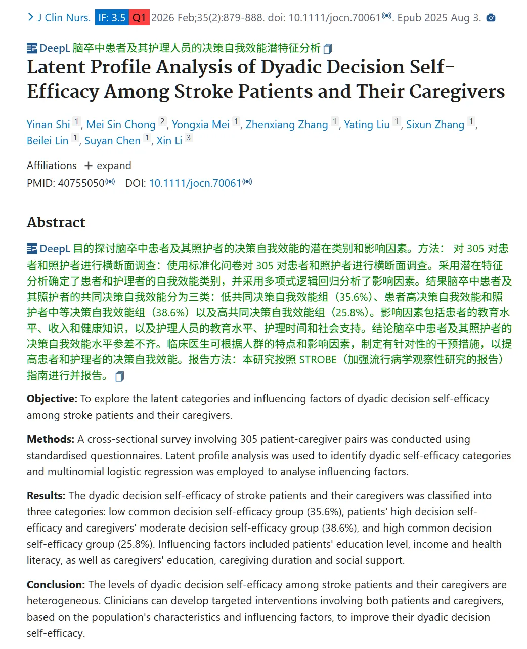 通过上述结构化分析,可以明确研究的各个要素,包括背景、研究目的、方法、结果和结论。研究揭示了脑卒中患者和照护者在决策自我效能方面的差异与影响因素,这为临床实践提供了重要的指导。通过针对性的干预措施,可以有效提升患者及其照护者的参与感和决策能力,从而改善整体护理效果和生活质量。这项研究为未来进一步探索决策自我效能的复杂性及其在不同健康背景下的作用提供了基础。