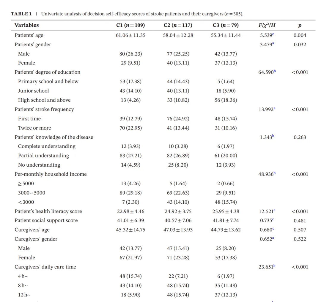 探讨脑卒中患者及其照护者的决策自我效能的潜在类别及其影响因素,以识别不同水平的自我效能并分析其背后的原因。