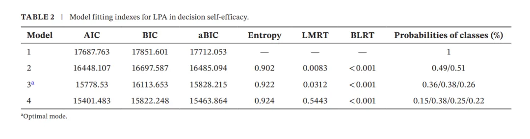 使用潜在特征分析(Latent Profile Analysis,LPA)将参与者分为不同的自我效能类别。