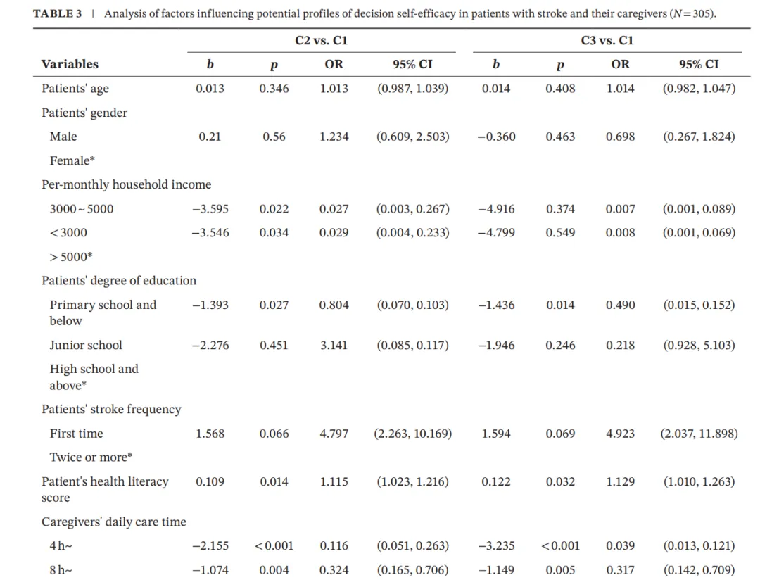 研究确定的影响因素包括患者的教育水平、收入、健康知识,以及照护者的教育水平、护理时间和社会支持。这些因素通过多项式逻辑回归分析被量化和检验,能够揭示影响决策自我效能的关键变量。